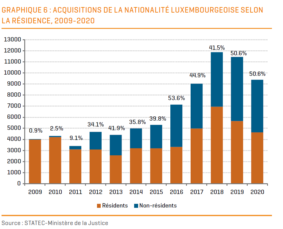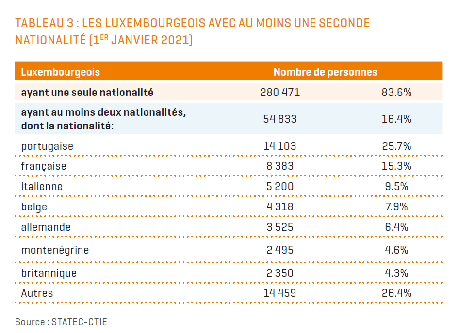 Denis Scuto, professeur d’histoire à l’Université du Luxembourg, a consacré un ouvrage passionnant aux mutations de la loi sur l’accès à la nationatité en les replaçant dans les débats politiques et philosophiques de l’époque et dans le contexte économique et social. L’argumenation utilisée au fil des années est restée d’une actualité effarante. En revanche, la présence massive de non-Luxembourgeois, à l’origine de la prospérité du pays, ainsi que le succès de la loi sur la « double nationalité », ont radicalement changé la donne. Les statistiques démographiques du STATEC montrent clairement que plus de 16% des Luxembourgeois ont une, voire plusieurs nationalités. On comprendra facilement que si l’on retirait les Luxembourgeois avec nationalité plurielle, la part des nationaux serait déjà tombée nettement en-dessous de 50%!