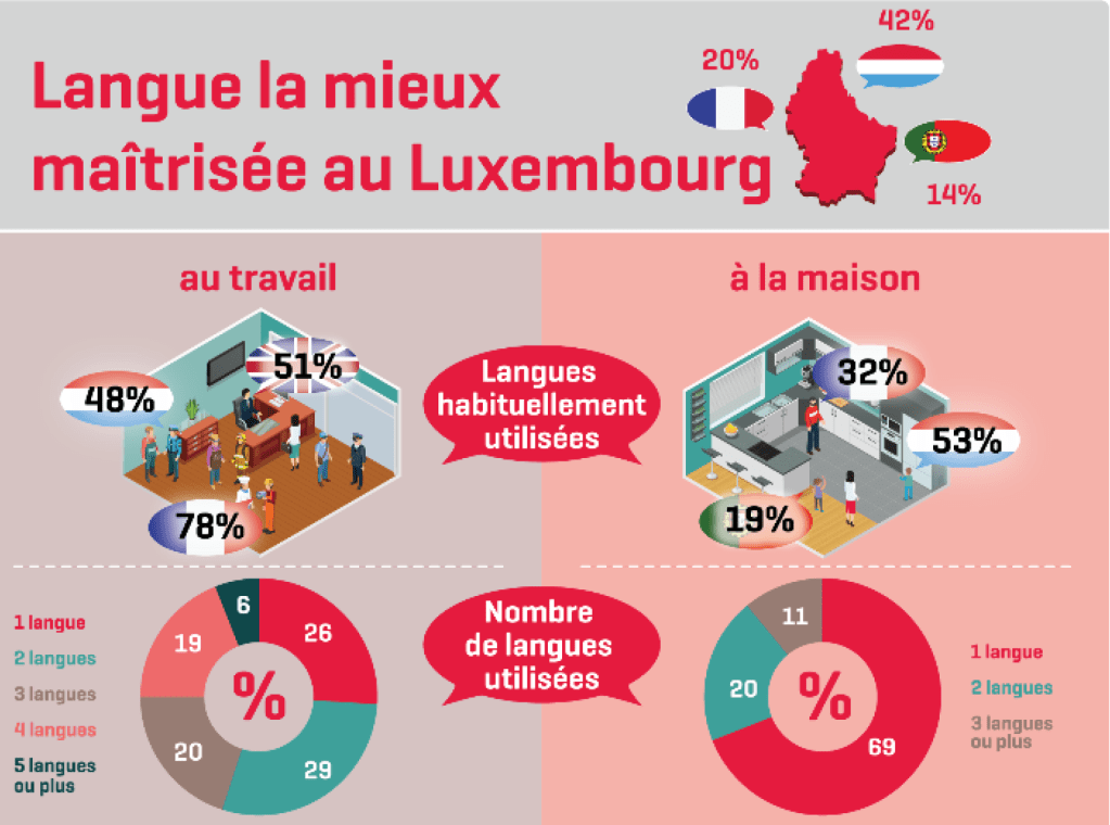 Les langues sont une des clés du vivre-ensemble. Le plurilinguisme permet de communiquer aisément et de faire tenir la diverisité. Il faut rendre grâce au professeur F.Felhen qui a été un pionnier dans l’exploration empirique de l’usage des langues parlées au Luxembourg. Il il y a maintentant un florilège d’ études, basées sur des enquêtes récentes, qui éclairent l’usage des langues et les caractéristiques des locuteurs. Le STATEC a apporté sa pierre en explorant cette problématique dans le Recensement Général de la population de 2011 et dans plusieurs enquêtes officielles. Les études attestent d’un multilinguisme puissant à l’échelle du pays, mais hétérogène selon les nationalités, elles attestent aussi de la vitalité de la langue luxembourgeoise. La langue luxembourgeoise domine à la maison, elles est très présente au travail. Le francais et l’anglais sont les langues du business (cf graphique). Le multilinguisme individuel, la maîtrise de plusieurs langues par une personne, est le faut d’un groupe pivot, composé surtout de Luxembourgeois, qui se retrouve au centre d’un tissu dont il peut assurer la cohésion.
